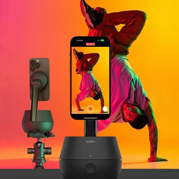 The easiest way to FaceTime, create action-packed videos, and go hands-free for livestreaming and video conferencing is here. Our Auto-Tracking Stand Pro follows your face and body movements with 360° rotation and 90° tilt with smooth, quiet motors. Grab and go — the internal battery offers 5 hours of operation on a full charge.