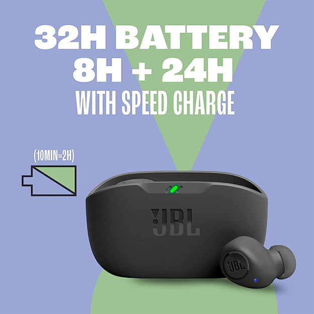 With 8 hours of battery life in the earbuds and 24 in the case, the JBL Vibe Buds provide all-day audio. And when you need more power, you can speed charge an extra two hours in just 10 minutes.