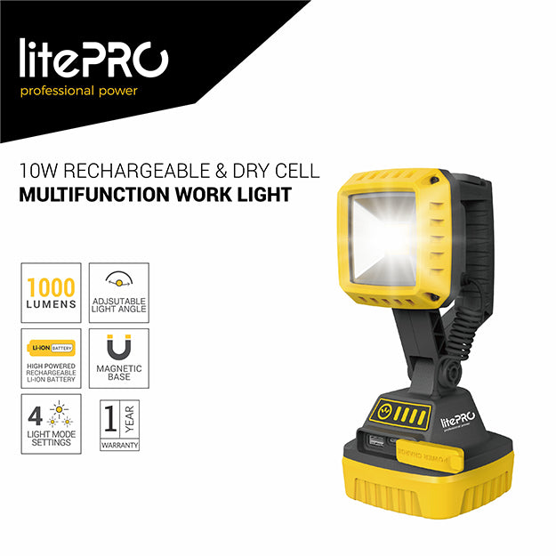 LitePro 10W Rechargeable And Dry Cell Multifunction Work Light 1000 Lumens - Black