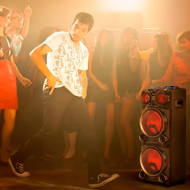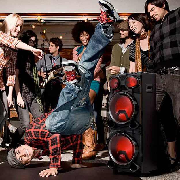 Take the party to the next level with this epic Bluetooth speaker! Loud, powerful sound and huge bass ensure every track will get people dancing. You get mic and guitar inputs, and colorful lighting effects add to the fun.