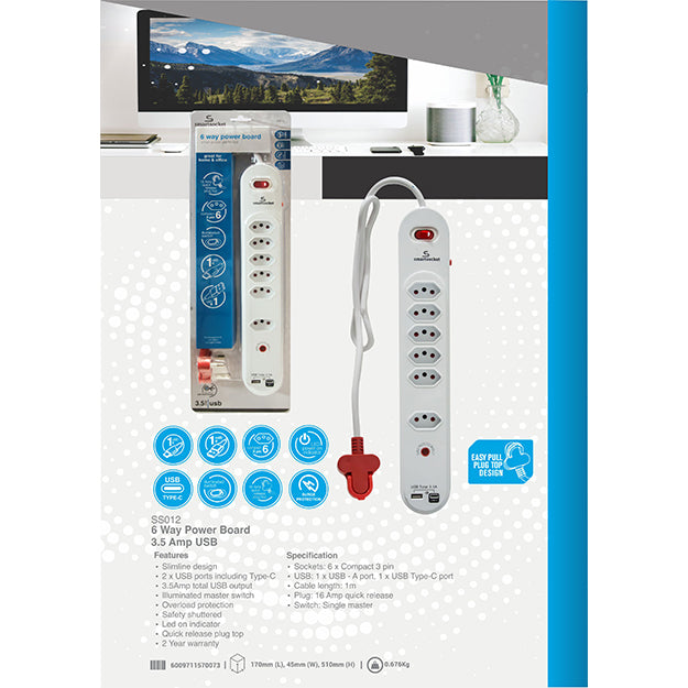 Power your devices with ease and safety using the SmartSocket 6 way Power Board With 3.5amp USB. Designed to keep your workspace organized while offering reliable surge protection.