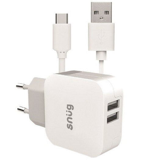 Snug 2 Port USB 3.4 Amp Wall Charger With Type C Cable - White