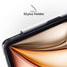 The case accommodates the stylus which attaches magnetically to the iPad. The magnetic flap protects the Apple Pencil and holds Pro Keys closed.